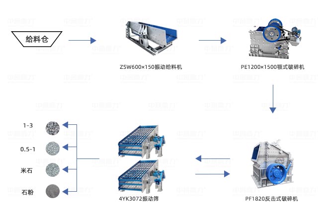 設(shè)備配置:ZSW600×150振動給料機+PE1200×1500顎式破碎機+PF1820反擊式破碎機+4YK3072振動篩2臺