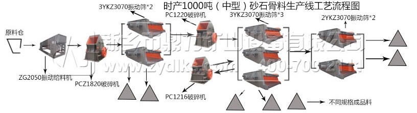 由一臺振動給料機均勻給料,進入破碎設備進行物料破碎,破碎物料接著進入振動篩進行篩分,不滿足粒度物料直接進入下破碎設備進行再次破碎�?梢愿鶕�(jù)成品料顆粒粒度的需求增加破碎設備和篩網(wǎng)不同孔徑的振動篩進行砂石生產(chǎn)線砂石物料的生產(chǎn)�?梢钥闯龃藯l生產(chǎn)線生產(chǎn)物料為顆粒比較細小砂石料。