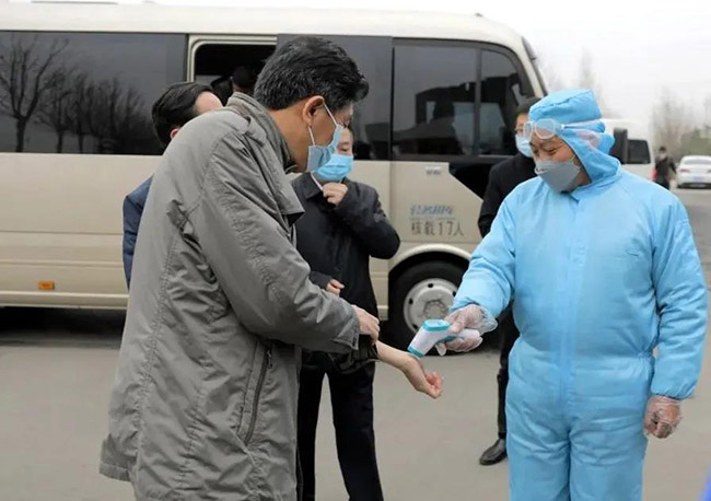 體溫檢測后進(jìn)入中譽鼎力智能裝備公司廠區(qū)