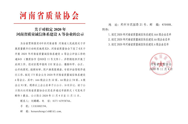 為面貫徹落實(shí)《中共河南省委河南省人民關(guān)于開展質(zhì)量提升行動(dòng)的實(shí)施意見》,河南省質(zhì)量協(xié)會(huì)下發(fā)了《關(guān)于開展2020年河南省質(zhì)量誠信體系建設(shè)A等企業(yè)評(píng)估工作的通知》(豫質(zhì)協(xié)字[2020]11號(hào)文件),中譽(yù)鼎力軟件科技股份有限公司積參評(píng)。公司自成立以來,堅(jiān)持“一言九鼎誠信天下”的經(jīng)營(yíng)理念,秉持對(duì)客戶負(fù)責(zé)的態(tài)度,以工匠精雕鑄鼎力品質(zhì),不斷開拓公司業(yè)務(wù),樹立了守法履約的良好企業(yè)形象和客戶口碑,入選“2020年河南省質(zhì)量誠信體系建設(shè)AA級(jí)企業(yè)”名單。