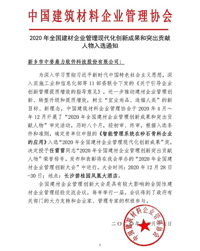 新鄉(xiāng)市中譽鼎力軟件科技股份有限公司作為礦山智能管理技術企業(yè)應邀參會,并憑借“智能管理系統(tǒng)在砂石骨料企業(yè)的應用”獲評“2019-2020年度建材企業(yè)管理現(xiàn)代化創(chuàng)新成果”典型案例獎;公司常務副總經(jīng)理任雷雷被授予“2019-2020年度建材企業(yè)管理創(chuàng)新突出貢獻人物”稱號!