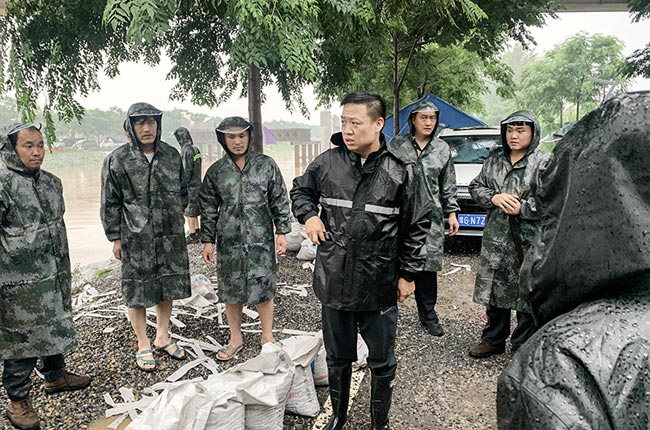 范工和大家一起“扎根”孟姜女河堤,嚴陣以待投入河道防汛救災工作(下圖右一)。他們頂風冒雨,不顧個人安危,搶裝防汛沙袋堵住壩口,一天一夜未眠,盡力守護河堤安。