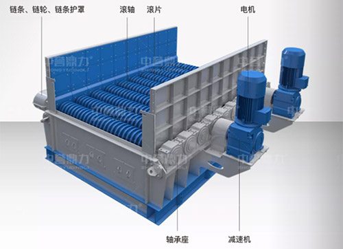 滾軸篩由箱體、軸承座、鏈條、鏈輪、滾軸、滾片、電機(jī)等結(jié)構(gòu)組成。開機(jī)啟動后,鏈輪通過鏈條帶動滾軸翻轉(zhuǎn),滾軸轉(zhuǎn)動方向與物料流動方向一致,泥土從相鄰滾軸與圓盤之間的間隙漏出,落在機(jī)器底部的皮帶機(jī)上排出,滾軸上方的大塊物料運(yùn)動到設(shè)備末端后排出,完成泥石分離。各軸之間的間隙可以根據(jù)實際需求進(jìn)行定制。