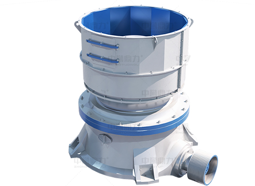 水平軸在電機(jī)帶動(dòng)下旋轉(zhuǎn),通過(guò)齒輪帶動(dòng)偏心套旋轉(zhuǎn),偏心套帶動(dòng)動(dòng)錐做圓錐擺動(dòng),與定錐形成連續(xù)擠壓,達(dá)到破碎石塊的目的。 通過(guò)調(diào)整動(dòng)錐底部的液壓缸,可以使動(dòng)錐上下運(yùn)動(dòng),從而控制排礦口的大小,進(jìn)而達(dá)到調(diào)成產(chǎn)品粒度大小的目的。液壓缸具有過(guò)鐵保護(hù)功能,當(dāng)有不可破碎物進(jìn)入破碎腔,液壓缸控制動(dòng)錐下落,不可破碎物下落排出后,動(dòng)錐自動(dòng)恢復(fù),設(shè)備恢復(fù)到正常工作狀態(tài)。