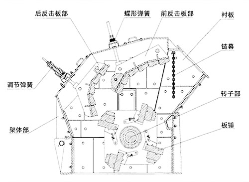 DLHCS反擊式破碎機主要運用沖擊能的破碎原理,轉子在電機帶動下高速旋轉,物料進入機腔后落入板錘工作區(qū),板錘在轉子的帶動下飛速旋轉,撞擊物料破碎,而后物料又被拋向機腔內壁的反擊襯板,后被反彈到板錘,與此同時,物料在機腔內互相碰撞,經多次破碎后達到成品料要求的物料從出料口排出。