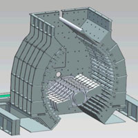 機(jī)殼采用雙腔對(duì)稱設(shè)計(jì),可一次性容納更多物料,提高破碎產(chǎn)量,工作時(shí),電機(jī)帶動(dòng)錘頭高速運(yùn)轉(zhuǎn),對(duì)從上方落入的物料形成沖擊力,此時(shí)的物料獲得動(dòng)能后高速撞向機(jī)腔內(nèi)壁的反擊板,造成物料的次破碎,從物料進(jìn)入機(jī)腔便相互碰撞形成自粉碎,物料在多次撞擊、研磨作用下達(dá)到所需粒度,從機(jī)腔側(cè)下方出料口排出,完成破碎過(guò)程。