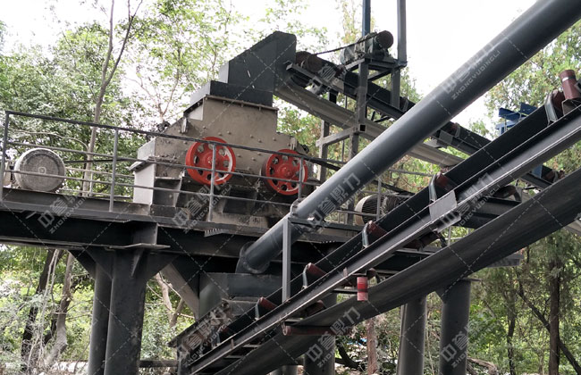原料經(jīng)皮帶輸送機(jī)從雙轉(zhuǎn)子制砂機(jī)ZSJ0808上方落入機(jī)腔進(jìn)行破碎,破碎后的物料經(jīng)一條皮帶輸送機(jī)送到一臺(tái)3YKZ2060振動(dòng)篩進(jìn)行篩分,篩分出5mm和小于3.8mm兩種成品砂,大于5mm的被一條返料輸送帶返回到制砂機(jī)進(jìn)行再次加工,形成一個(gè)閉路循環(huán)。