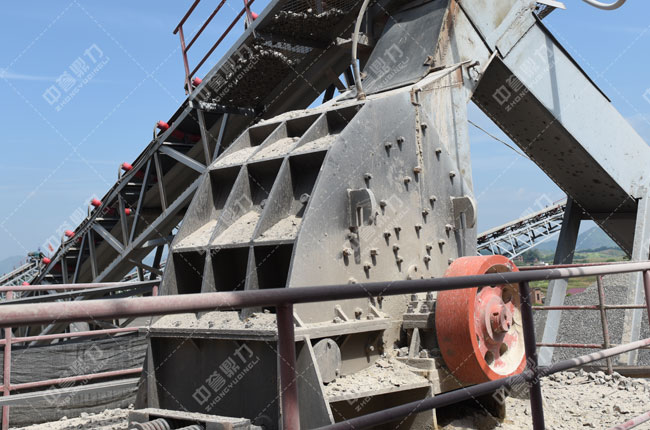 大塊石料經(jīng)料倉均勻、連續(xù)的送到PCZ1512重型錘式反擊破碎機(jī)進(jìn)行粗碎,粗碎后的物料經(jīng)輸帶送到一臺2YKZ2460振動篩進(jìn)行篩分,篩分出一種20-30成品石子,大于31.5mm的料被一套輸送帶返回進(jìn)行再次破碎,小于31.5的碎石被輸送到一臺2YKZ2460進(jìn)行篩分,篩分出10-30、5-10和石粉三種成品料。