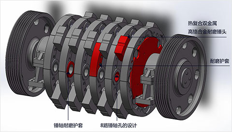 錘軸孔上設(shè)計護套、轉(zhuǎn)子盤上設(shè)計護圈,性高,無需每天更換,哪塊有損壞更換哪塊,增加了開機時間