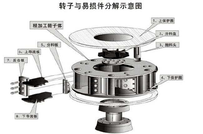 沖擊破制砂機(jī)易損件共有15個:上/下軸套(進(jìn)料斗部位)、減震橡膠、甩輪護(hù)口圈、上∕下流道板、沖擊塊、分料錐、板、拋料頭、下料襯環(huán)、進(jìn)料管、上∕下?lián)舸蜃o(hù)板、料斗襯環(huán)、分料盤、散料盤、周護(hù)板等。